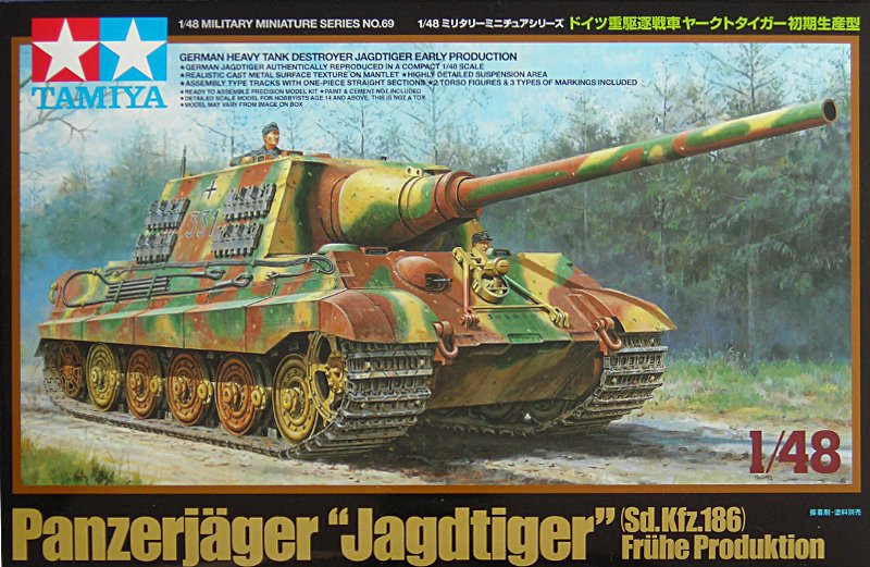 Bausatz: Nachdem Tamiya in 1/48 bereits den Tiger II herausgebracht hatte und kürzlich in 1/35 auch ein neuer Jagdtiger auf den Modellbaumarkt kam, war die Hoffnung bei den Quarterscalern groß, dass auch in 1/48 ein Sd.Kfz 186 folgen würde. Pünktlich nach der Sommerpause und zum Weihnachtsgeschäft ist nun dieses Fahrzeug erschienen. Der Bausatz zeigt sich Tamiya-typisch mit schönen Außendetails, die aber oft "Baugruppenweise" abgespritzt sind und ohne Innendetails. Für den Sammelfreund liegen auch wieder Gewichte bei (zum Glück hat Tamiya die Metallwannen aufgegeben).