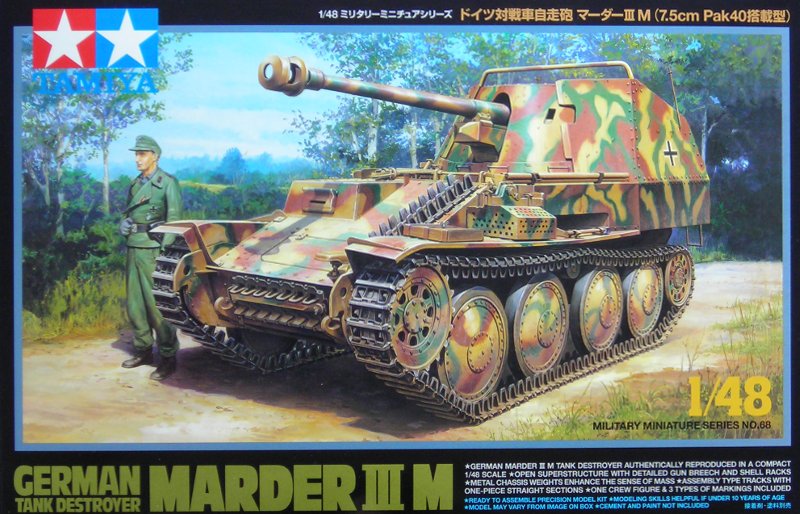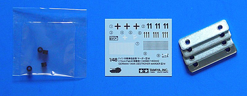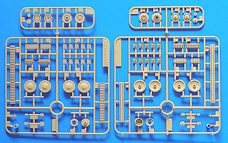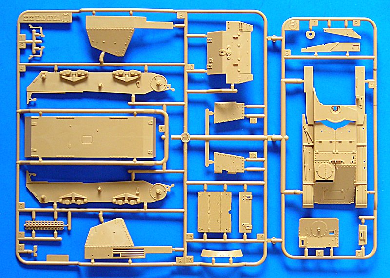 Bausatz Konsequent setzt Tamiya die Reihe der Fahrzeuge auf Panzer 38(t)-Fahrgestell fort. Nachdem bereits vor einiger Zeit erschienen Marder III mit PaK 7,62(r) erscheint nun die Ausführung M, die sich recht gravierend vom Vorgänger unterscheidet. Der Bausatz entspricht voll und ganz der gewohnten Tamiyaqualität. Fast alle Spritzlinge sind neu Lediglich der Spritzling A mit den Laufrädern und Ketten ist der gleiche wie im ersten Marder III. Das Fahrzeug entsteht vollständige aus Sprizgussteilen, die von innen mit einigen Metallstücken beschwert werden können (aber nicht müssen). Die Bauteile sind sehr sauber abgespritzt und gut detailliert. Natürlich gibt es einige Vereinfachungen, aber auf sehr hohem Niveau (z.B. einige angespritzte Werkzeuge, Munitionshalterungen usw.).