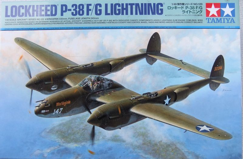 Vorbild: Lockheed begann in den 1930er Jahren ein Konzept für ein zweimotoriges Hochleistungs-Jagdflugzeug zu erarbeiten. Kernpunkt war die Idee, das neue Modell mit sogenannten Turboladern auszurüsten. Die Turbolader sollte die Leistung der Motoren auch in großen Höhen stabil halten. Lockheed entschied sich zu einem bahnbrechenden Aufbau der Flugzeugzelle mit einem doppelten Leitwerksträger, zwischen dem sich in der Mitte die Gondel für den Piloten und die Hauptbewaffnung aus vier 12,7 Maschinengewehren und einer 20mm Kanone befand. Eine Idee, welche letztendlich zum Erfolg der Lightning führte. Der Antrieb der Lightning erfolgte durch zwei Allison V-1710 Motoren. Jedenfalls bei der Serie, welche Tamiya als Bausatz offeriert. Die Propeller waren gegenläufig, um das Drehmoment auszugleichen. Der erste Prototyp:XP-38 flog am 27.Januar 1939. Die Varianten P-38F/G wurden, nach dem Überfall durch die kaiserlich-japanische Marine auf den U.S. Stützpunkt Pearl Harbor auf Hawaii, hauptsächlich im Südpazifikraum eingesetzt. Die Lightning gehörte im Zweiten Weltkrieg zu einem der meist eingesetzten Jagdbomber. Spätere Modelle bekamen dann die bekannteren größeren Lufteinläufe. Es gab Bombervarianten, "Droop Snoot" genannt und auch Nachtjäger mit einem Behälter unter dem Bug, in dem sich ein einfaches Radargerät befand, welches von einem zweiten Besatzungsmitglied bedient wurde. Die P-38M wurde noch im Koreakrieg eingesetzt.