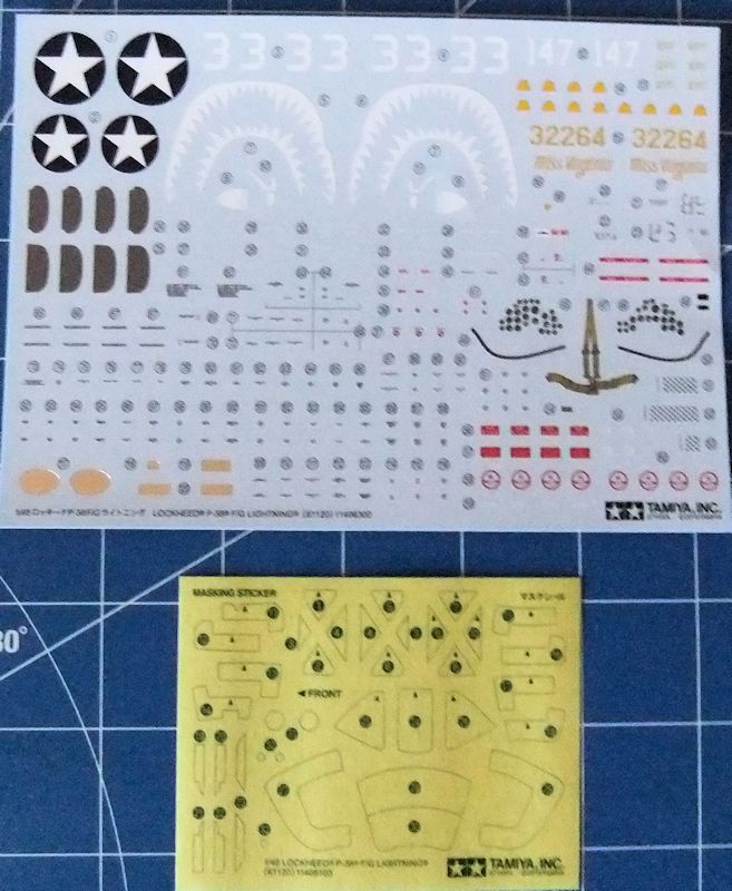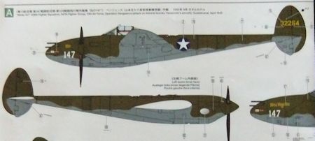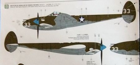 Die zweite Möglichkeit der Gestaltung der P-38 ist die Ausführung "F", weiße 33 mit Haifischzähnen an den Motorgondeln. Die war auf Port Moresby, Neu Guinea stationiert. Tamiya legt die Decals der Zähne in einem Low Visible Ton bei. Gesichert ist diese Ausführung der Bemalung nicht.