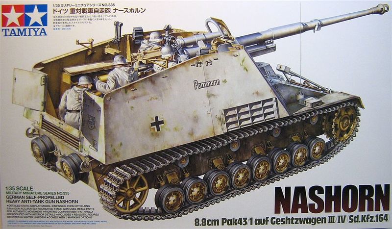 Wissenswertes zum Original: Am 22. Juni 1941 begann die Operation Barbarossa mit der die deutschen Streitkräfte mit starken Kräften in die Sowjetunion einbrachen. Als sie das erste Mal den russischen T-34 Panzer sahen wurde es klar, dass Gegenmaßnahmen nötig waren. Im Juli befohl Hitler die Entwicklung einer Selbstfahrlafette mit der 8,8 cm PAK 43, eine Waffe die auf der erfolgreichen 8,8 cm Flak 41 beruhte. Ursprünglich unter dem Namen Hornisse entwickelt wurde der Name nachher in Nashorn geändert; angeblich wegen der Aversion Hitlers für solch eine starke Waffe den Namen eines Insekts zu verwenden.