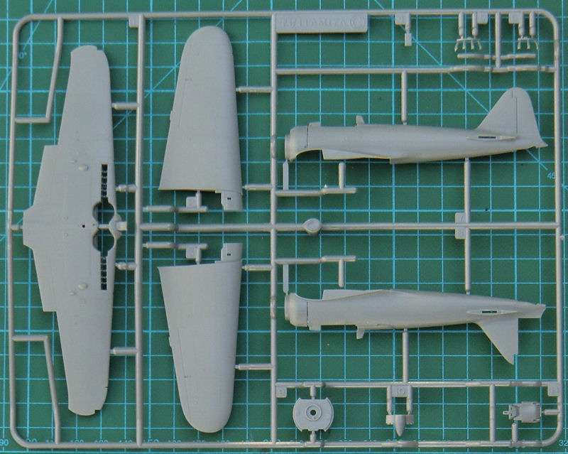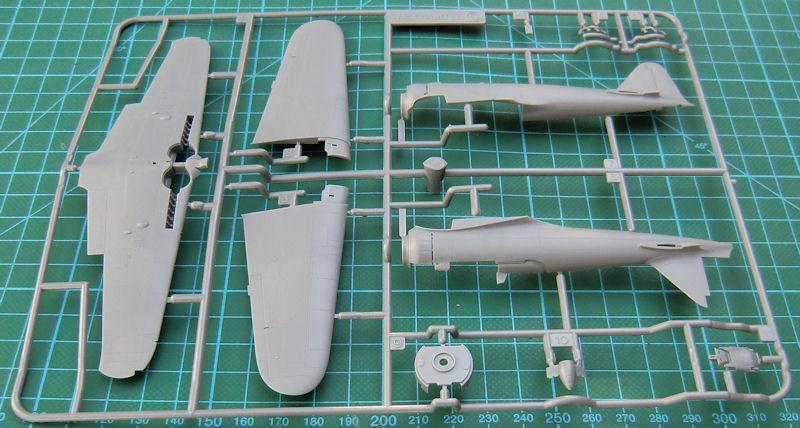Die Tragfläche besteht aus drei Teilen. So gibt es eine Unterseite mit der richten V-Form und zwei oberen Hälften. An letzteren sind die Querruder komplett anmodelliert. Das Höhenleitwerk besteht aus zwei Teilen. Hier gibt es auch scharfe Hinterkanten. Tamiya hat auch beim Seitenleitwerk das Ruder einseitig anmodelliert. Das Fahrwerk samt deren Schächten sehr detailliert. Tamiya liefert eine Kanzel die optional offen angeklebt werden kann. Weiterhin gibt es noch einen Zusatztank.