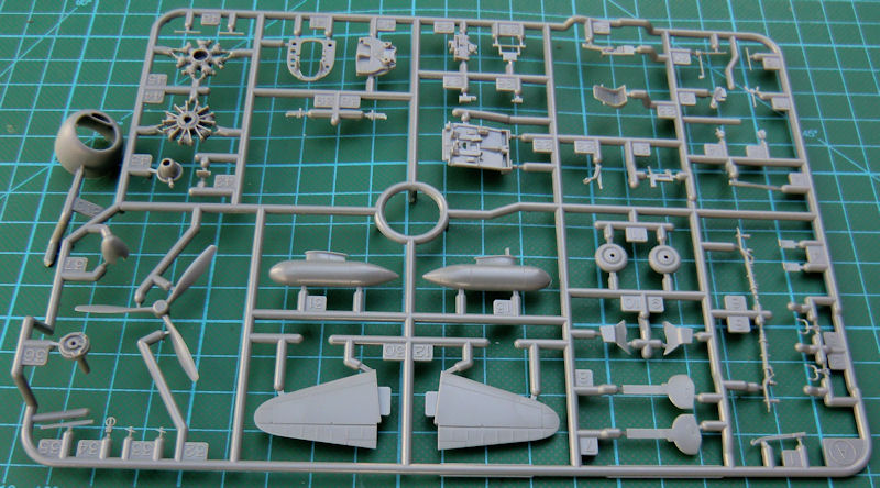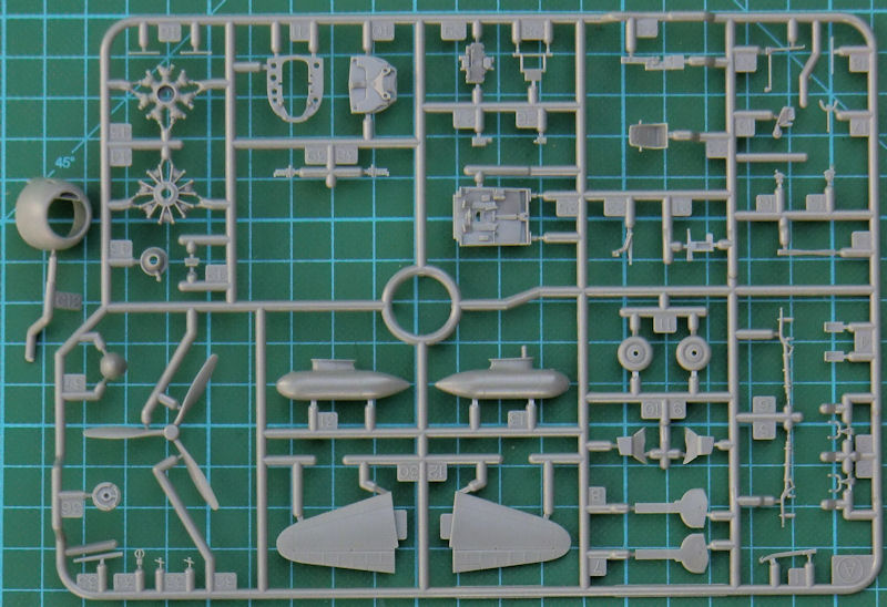 Die Spritzgussteile sind sehr fein und recht komplex reproduziert. Das gilt auch insbesondere für das Cockpit. So hat z.B. der Sitz feine aufmodellierte Sitzgurte und das Instrumentenbrett schöne Strukturen. Das setzt sich natürlich an den Rumpfinnenseiten und dem Cockpitboden fort. Der Motor entsteht aus sieben Teilen und verschwindet hinter der komplexen einteiligen Motorhaube.