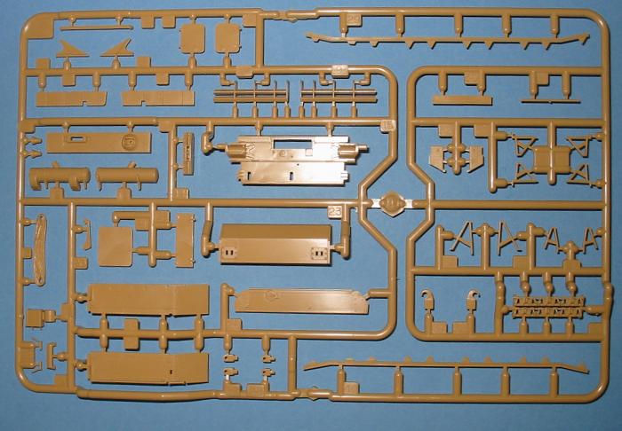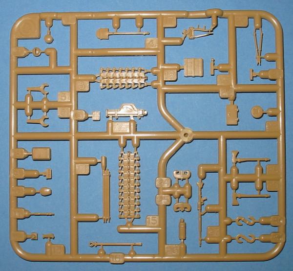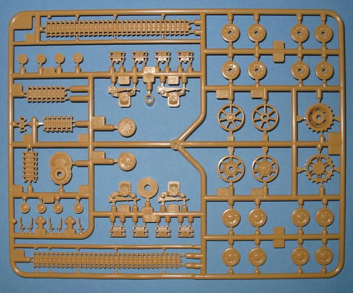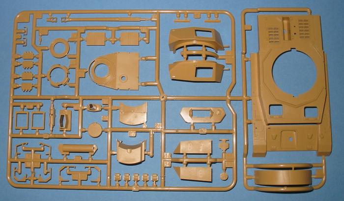 Der Bausatz präsentiert sich im Tamiya-typischen beige. Aus 5 sauber abgespritzten Gußrahmen und der obligatorischen Metallwanne soll der Panzer zusammengebaut werden. Die Detaillierung ist gut, die Werkzeuge sind zum überwiegenden Teil extra zu montieren und nicht bereits an die Wannenteile angegossen (wie beim Tiger). Zimmerit ist nicht vorgesehen, hier ist also Eigeninitiative gefordert, falls man denn möchte.