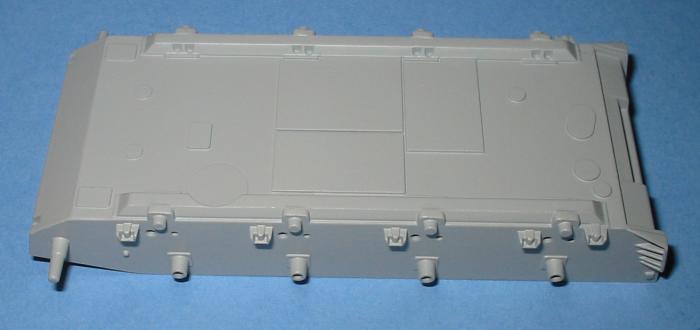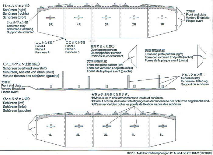 Die Schürzen für den Turm sind etwas dick, aber zur Kante hin angeschrägt, so dass optisch einiges an Materialstärke verschwindet. Die Schürzen für die Seite sind nicht beigelegt, aber ihre Herstellung ist sehr gut erklärt und es liegt eine maßstäbliche Zeichnung bei. Einige Modellbauer werden hier sicher auf Ätzteile zurückgreifen (z.B. Hauler, eduard,...). Die Kettensegmente gefallen mir übrigens sehr gut bei Tamiya. Das obenliegende Segment ist auch wieder sehr schön durchhängend modelliert.
