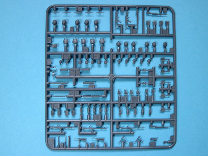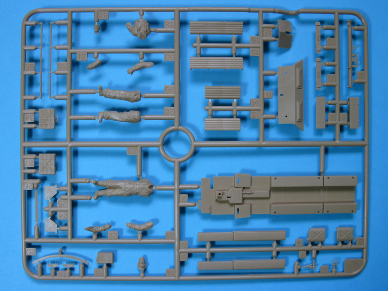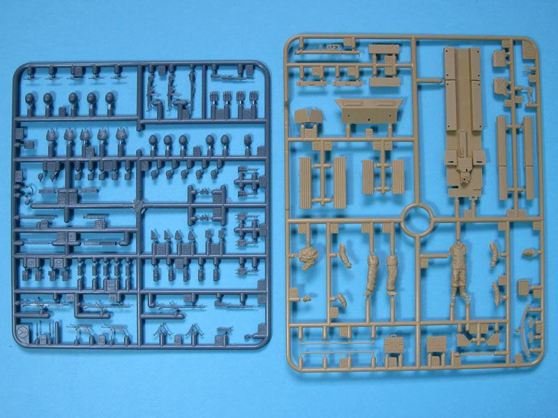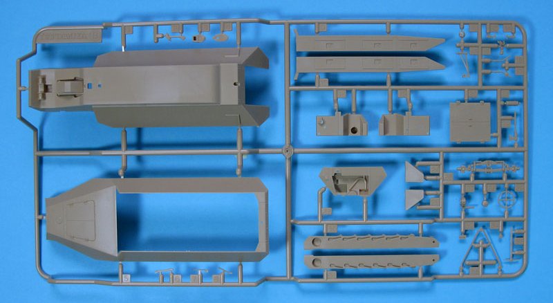 Der Karton, bedruckt mit einem ansprechenden Einsatzmotiv des Panzerspähwagens und weiteren Bemalungsvorschlägen an den Schmalseiten, enthält vier beige Spritzlinge zum Bau des Sd.Kfz.251 Ausführung D und zweier Figuren, sowie einen grauen Spritzling mit umfangreichem Zubehör und Ausrüstung für die angenommene Besatzung des Fahrzeuges.