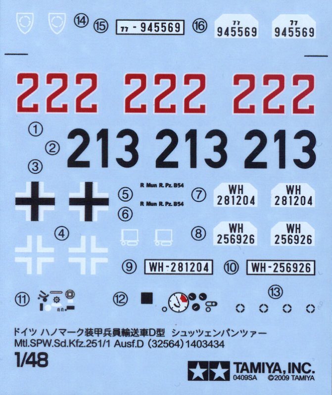 Ein kleiner, aber dicht bedruckter Decalbogen rundet das Gesamtbild ab. Er beinhaltet drei Versionen der späten D-Variante des 251er, einmal Ostfront Winter 1943, dann die 5.Panzerdivision Wiking, Warschau August 1944 und zum Schluß eine nicht näher bestimmte Einheit der Wehrmacht in der Normandie 1944. Ausserdem natürlich die Anzeigetafeln des Instrumentenbrettes und Funkgerätes.