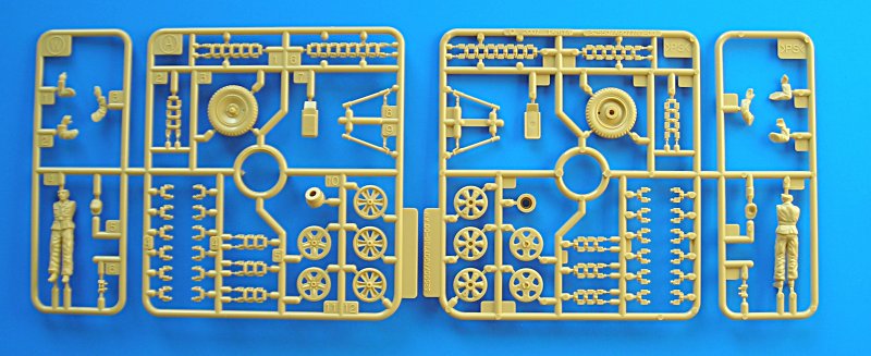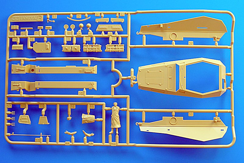 Alle Teile sind, wie für Tamiya typisch, hervorragend in 4 Gussrahmen abgespritzt. Auffällig ist die recht große Anzahl von "Baugruppen", die als einzelnes Teil zusammengefasst sind, so z.B. die Bodengruppe im Innenraum oder die Laufrollen. Ich finde das in Ordnung, da die Detaillierung trotzdem noch ausreichend ist ... es bietet aber auch Potential für die Superdetaillierer unter uns.