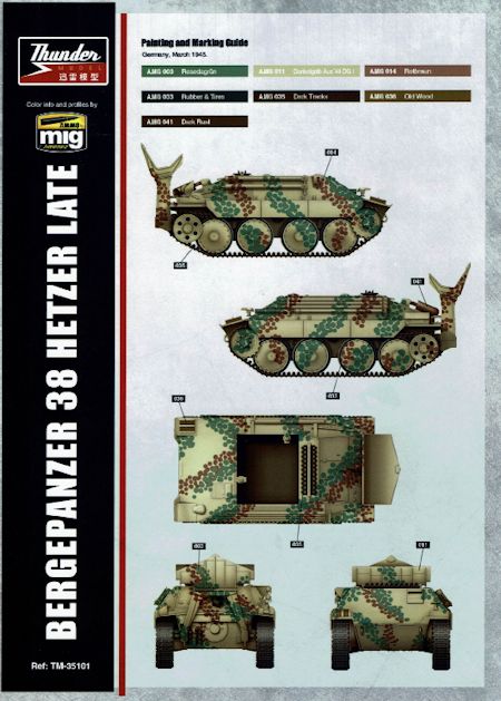 Bemalung: Die sechszehnseitige Bauanleitung ist klar und übersichtlich aufgebaut. Sie führt durch 28 Bauabschnitte. Bei den Farben bezieht sich Thunder Model nur auf den Hersteller Mig. Ein "Painting and Marking Guide" verweist auf zwei verschiedene Varianten - Deutschland, März 1945 und Rheinland 1945 die sich nur im Tarnmuster unterscheiden.
