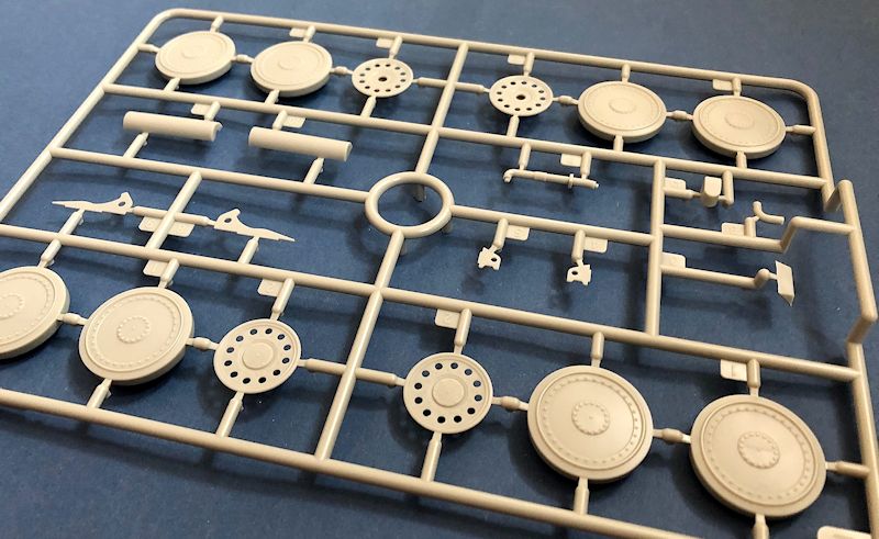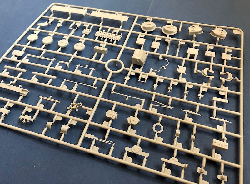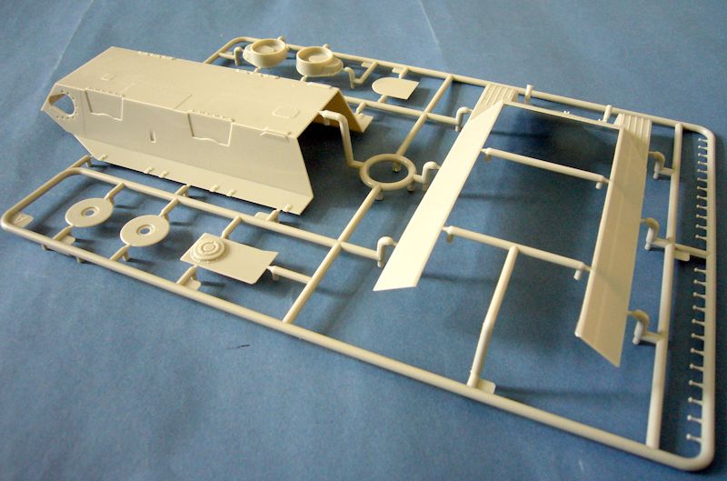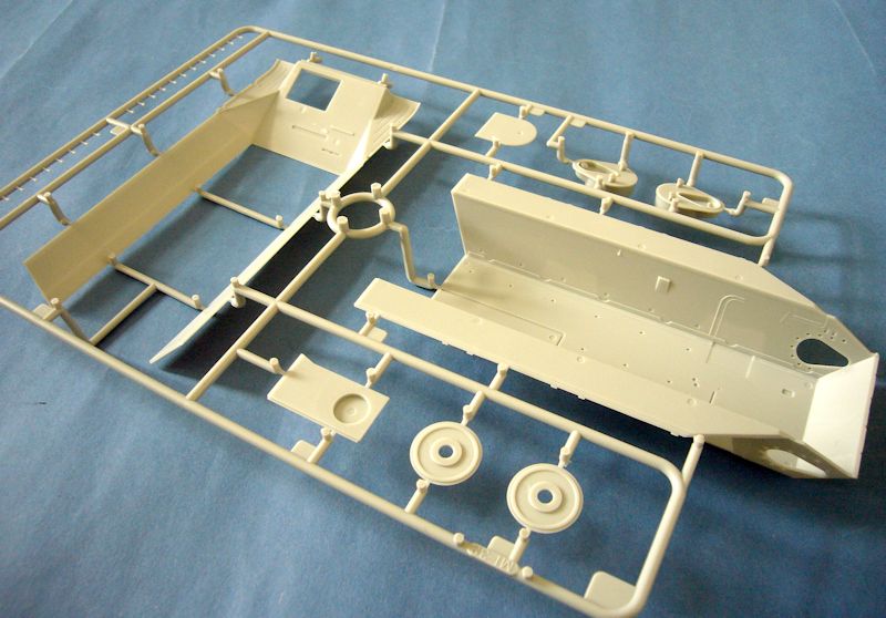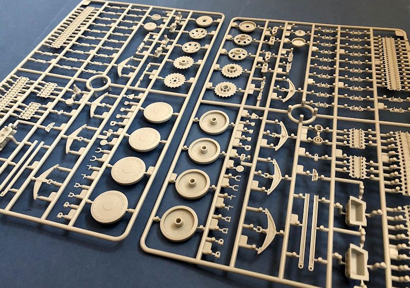 Bausatz: Die sechs hellgrauen Gußäste sind einzeln in Folien eingeschweißt und einem sehr stabilen Klappkarton verpackt. Die Teile für das Modell der Version von BMM, sehen hinsichtlich Detaillierung und Finesse ganz ordentlich aus, befinden sich aber nach meiner Einschätzung nicht auf dem Niveau von Tamiya oder Dragon.