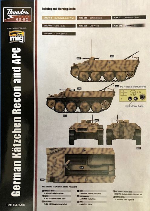 Bauanleitung/Bemalung: Die Bauanleitung ist sehr gut gemacht und führt auf 12 s/w Seiten in 3D Zeichnungen über 19 Baustufen zum finalen Modell. Für die Bemalung liegt ein zweiseitiges, farbig gedrucktes Blatt in Din A4 bei auf dem drei unterschiedliche Schemata gezeigt werden.