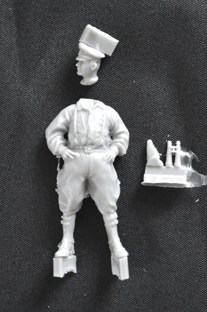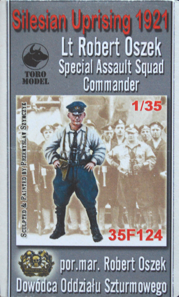 Bausatz: Die polnische Firma Toro Model stellt mit dieser Figur den Leutnant Oszek als Anführer des "Spezialangriffskommandos" zur Zeit der Schlesischen Aufstände 1921 dar. Sie kommt in einem stabilen Faltkarton daher. Auf dem Cover findet man eine bemalte Version von Przemyslaw Szymczyk, der zugleich Modelleur ist, nebst den üblichen Informationen und Hinweisen. Im Karton bekommt man in einem Beutel 4 graue Resinteile sowie 3 kleine Blätter mit Vorbildinformationen. Das Resin ist sauber gegossen. Verzug gibt es keinen und die Angussblöcke sind relativ klein gehalten, dafür muss man die Teile von einigen Fischhäuten befreien. Lufteinschlüsse habe ich, bis auf eine kleine Blase an der Mütze, keine gefunden. Die Teile wurden gut und der Körper anatomisch korrekt modelliert. Die Detaillierung, ebenso der Faltenwurf sind ansprechend und erleichtern die Bemalung.