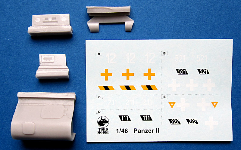 Tamiya hatte sich für den Release seines Panzerkampfwagen II entschlossen, die Variante aus dem Frankreichfeldzug im Modell darzustellen. Da der kleine polnische Hersteller ToRo Model bekanntlich einen Fokus auf die heimatliche Geschichte legt, hat Tomasz Mankiewski einen kleinen Umbausatz herausgebracht, der die Darstellung eines früheren Fahrzeugs mit rundem Bug erlaubt. Für den Umbau liegt keine Bauanleitung bei, aber die 5 Bauteile ersetzen einfach die Plastikteile aus dem Bausatz.
