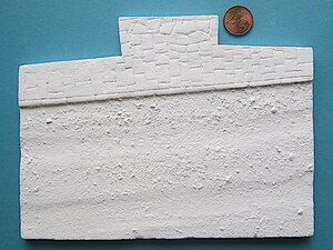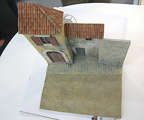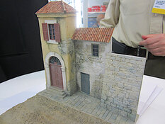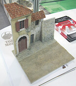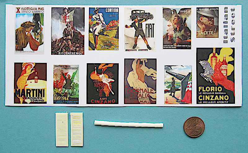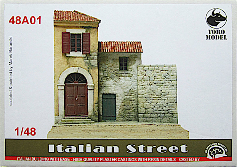 Bausatz: Im Karton finden wir zunächst einen mit Werbe- und Propagandaplakaten bedruckten Papierbogen. Sowie einige Resinteile. Den Hauptbestandteil machen aber die 10 Keramikteile aus. Die Bodenplatte ist 18 x 13,5 cm groß, wobei für die Stellfläche die Fassade abzuziehen ist. Mein Jagdpanther passt bequem auf den Straßenbereich (das Rohr steht allerdings etwas über). Die Restlichen Teile bilden den etwas zerklüfteten Fassadenaufbau, dar dadurch aber interessant ist. Dankenswerter Weise ist die Straße als Sandweg gehalten und damit ist das Modell recht universell einsetzbar und das Szenario nicht auf Italien beschränkt.