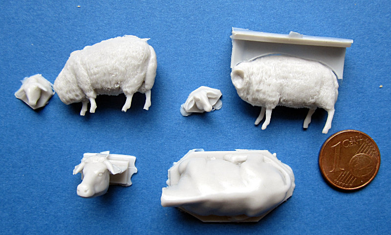 Dieser Satz einhält zwei Schafe und eine liegende Kuh für die Verwendung in nahezu allen Epochen. Tomasz hat allerdings diese Figuren in der Normandie lebenden Vorbildern nachempfinden lassen. Dies schränkt die Verwendung nach meiner Meinung aber kaum ein, zumindest für einen europäischen Schauplatz. Der Guss ist einwandfrei und die Gestaltung sehr gut. Die separaten Köpfe sind der Formhaltbarkeit geschuldet, aber nur ein geringes Problem. Für mich wird die Bemalung der anspruschvollere Part.