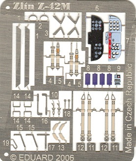 Für das bei TOGA erschienene Modell der Zlin Z-42M lies TOM bei eduard ein bedrucktes Ätzteil-Set anfertigen. Meinem Muster lag noch keine Bauanleitung bei, die soll jedoch zum Standard gehören. Die Ätzteile enthalten alle beim Bau der Zlin (Siehe Baubericht!) vermissten Teile. So gibt es ein bedrucktes Instrumentenbrett, welches aus zwei Teilen besteht. Ebenso sinnvoll sind die bedruckten Sitzgurte. Für die Außendetaillierung gibt es alle notwendigen Kleinteile.