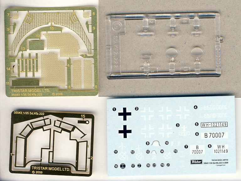 Zum Bausatz: Nachdem dieser neue Bausatz vom Sd.Kfz.222 schon länger als ein Jahr angekündigt war, ist die Freude um so größer das er endlich in den Regalen der Händler liegt. Was erwartet nun den ungeduldigen „Sammler und Jäger“? Keine Sorge, er kommt voll auf seine Kosten: Sieben, sauber in braunem Plastik, gespritzte Gießrahmen, einen klaren Spritzling, vier Gummireifen, acht Spiralfedern, zwei Ätzteilplatinen, einen Decalbogen und die sehr ausführliche Bauanleitung mit Farbangaben für Gunze Farben.