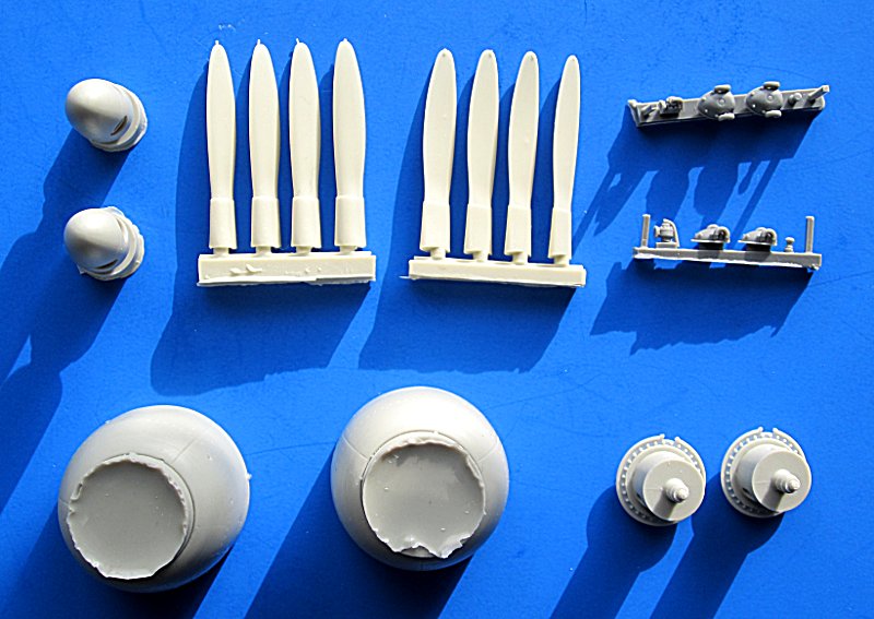 Der Guss der Teile ist gut und die Details ebenso. In den Cowlings gibt es ein-zwei Lufteinschlüsse, die von innen geöffnet und mit Sekundenkleber oder Ähnlichem aufgefüllt werden sollten. Die Propellerblätter haben an Ihren Spitzen einige Steiger die vorsichtig entfernt werden müssen, aber das sollte kein Problem sein.