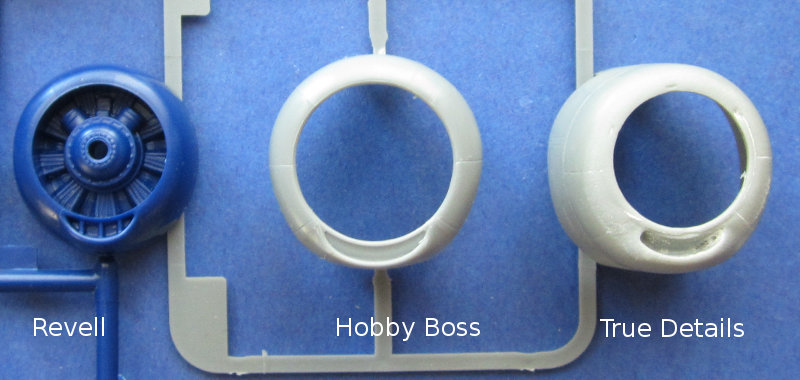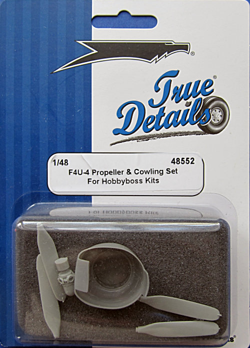 Auch für die F4U-4 Corsair von HobbyBoss (First Look) gibt es einen Korrektursatz für die Motorhaube und den Propeller. Das Foto unten gibt den UNterschied zwischen den Teilen hoffentlich ganz gut wieder, allerdings ist die Cowling von True Details noch nicht vollständig versäubert und wird wahrscheinlich auch noch eine etwas größere Einlassöffnung bekommen, wenn der Anguss komplett entfernt ist.