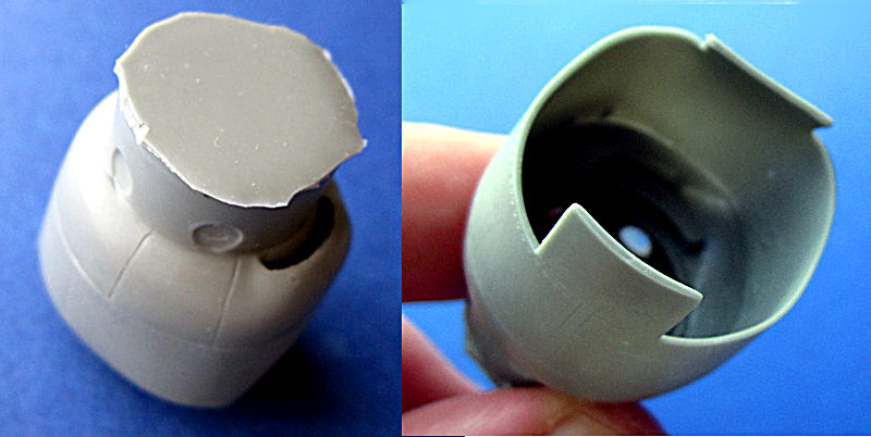 Beim P-61 Satz war ich vom Guss noch recht angetan, was TD aber hier bietet ist schlichtweg eine Frechheit! Vielleicht habe ich ja auch eine Montagsproduktion bekommen, aber solche Teile dürfen nicht in den Verkauf. Das Material ist weich wie Gummi und dazu noch ungleichmäßig stark. Die hinteren Ausläufer der Cowling ragen bis gegen die Blisterverpackung und sind natürlich stark verbogen. Dazu ist das ganze Teil in sich krumm und schief. Ein richten in warmem Wasser war möglich, aber das Bauteil ist aufgrund der genannten Materialeigenschaften dafür prädestiniert, sich schnell wieder zu verformen. Der Anguss geht ohne klare Definition in das Resinteil über. Am Übergang zeigen sich schlieren und Lunker. Daher ist auch noch nicht ganz klar wie groß die Motoröffnung sein wird, im Bild oben ist der Anguss gerade an der Haubenfront abgesägt.
