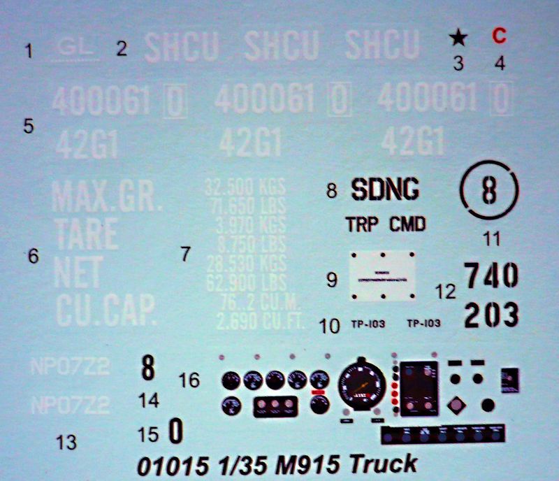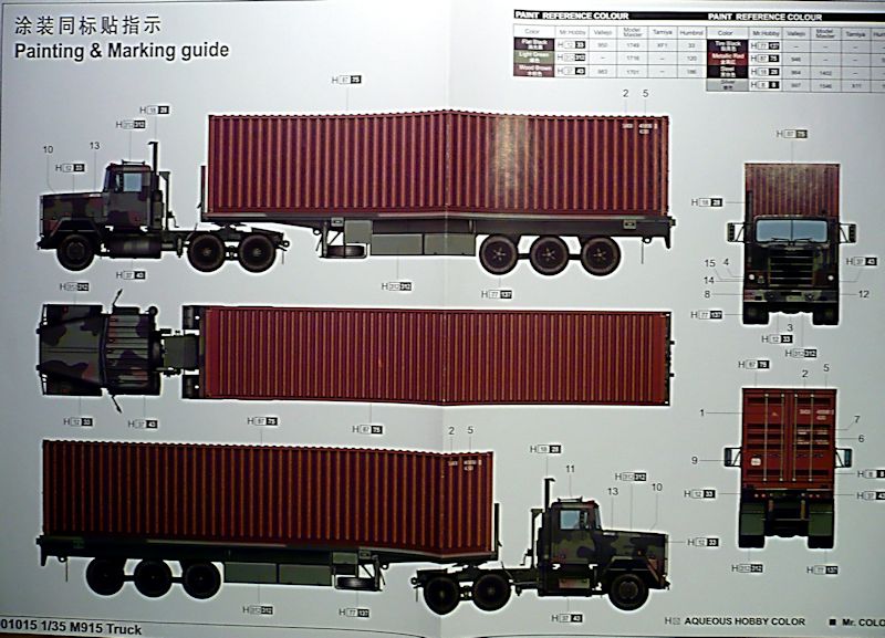 Bemalung: Ein Painting und Marking Guide hilft bei der Bemalung des Fahrzeuges. Die Farbangaben beziehen sich Mr.Hobby, Vallejo, Model Master, Tamiya und Humbrol. Die Markierungen des LKW fallen etwas spärlich aus. Es wurde hier kein Vorbildfahrzeug gewählt. Die Markierungen sind neutral gehalten und beziehen sich hauptsächlich auf die Fahrzeugnummerierung sowie die Gewichtsspezifizierung des Containers. Schön gemacht ist das Abziehbild für das Kombiinstrument im Fahrerraum.