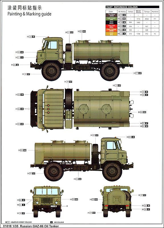 Bemalung: Nur eine Tarnung eines undefinierten Fahrzeugs wird angeboten, Vorbildfotos gibt es aber genügend. Die Farben auf dem Extrablatt mit der Tarnung werden mit Mr.Hobby-Bezeichnung angegeben, eine Vergleichstabelle nennt noch Vallejo, Model Master, Tamiya und Humbrol (diese 4 nur unvollständig).