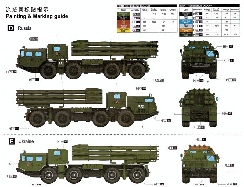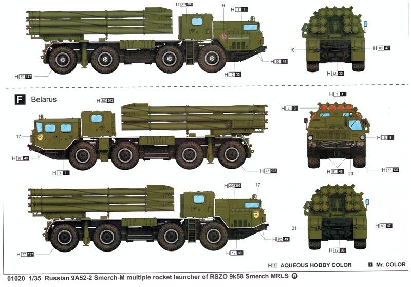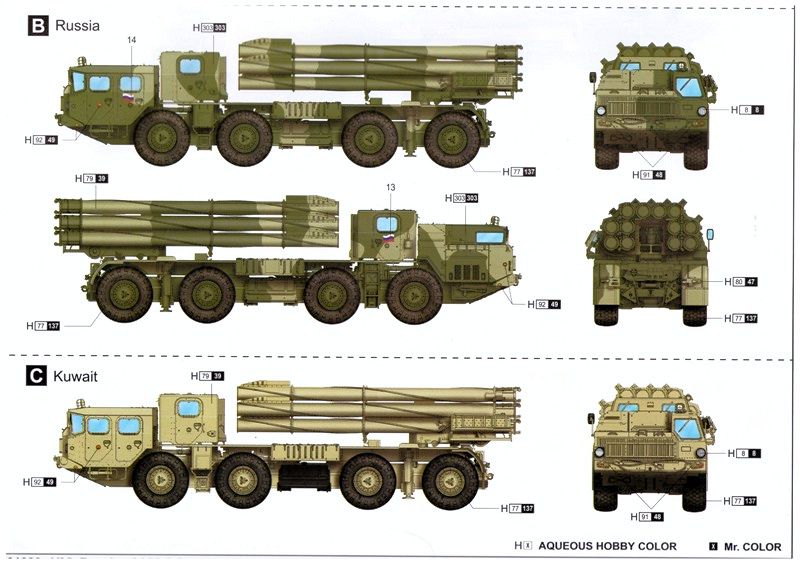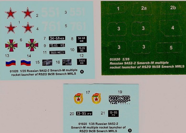Bemalungsvarianten: Auf zwei Decalbögen verteilt sind die Markierungen für sechs verschieden Fahrzeuge aus Russland(3), Kuwait(1), Ukraine(1) und Belarus(1). Der farbige Bemalungshinweis zeigt diese sechs Fahrzeuge im einfarbigen russischen Grün, in russischer Zweifarbentarnung, sandfarben, und helleren Grün für Ukraine und Belarus.