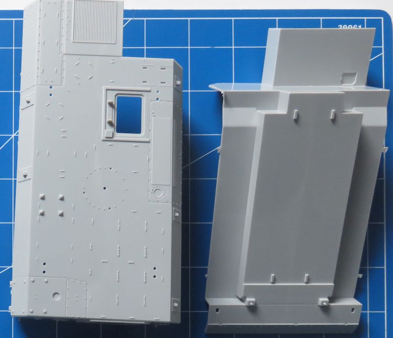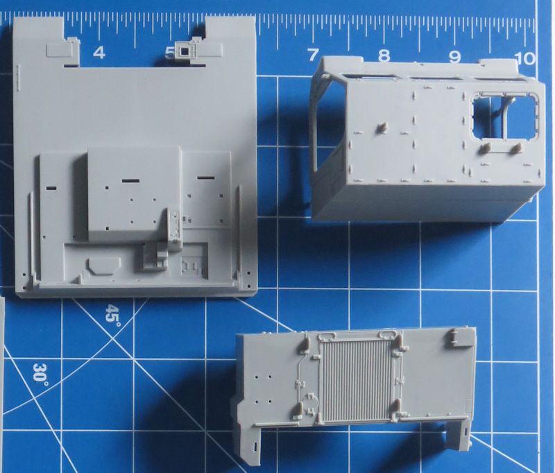 Bausatz: Der neue Bausatz von Trumpeter ist exzellent abgespritzt und recht gut detailliert. Diese Einschränkung bezieht sich auf das Fahrwerk, nebst sehr gut gemachtem Fahrerhaus, welches komplett mit Innereien und mit zu öffnenden Türen plus einem Fla-MG versorgt ist. Der Kommando Aufbau hingegen ist vollkommen geschlossen und ohne jegliche Inneneinrichtung. Hier hätte man sich deutlich mehr gewünscht. Auch eine offen darstellbare Eingangstür wäre sicherlich ganz nett gewesen. Dafür hat man die zugehörige Treppe allein aus sieben (!) Teilen gefertigt. Der große typische Antennenmast nebst der ausklappbaren Luke ist somit praktisch auch nicht vorhanden. Also, reichlich Spielraum für eigene Kreativität beim Bau des Musters. Einzelkettenglieder sind vorhanden und Trumpeter hat sicherlich auch Teile ihres früheren Bradley-Kits hier nachgenutzt und die Passgenauigkeit ist ebenfalls mit diesem Vergleichbar.