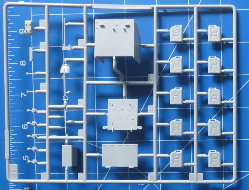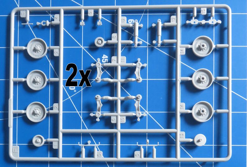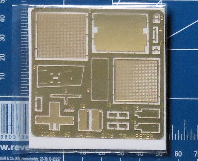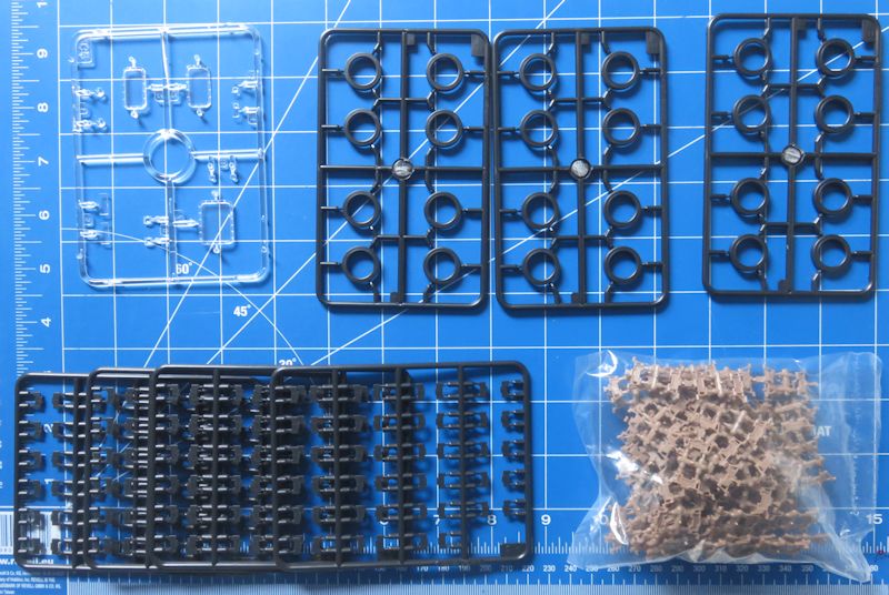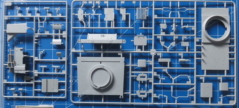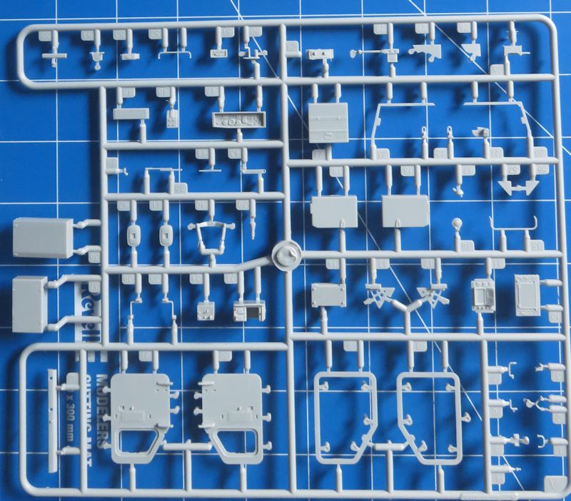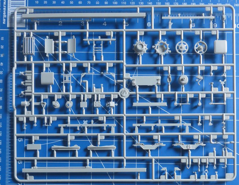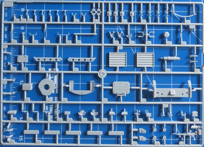 Zusammen ergibt das stattliche rund 560 Einzelteile, die zu verbauen sind - aufgeteilt auf 19 Spritzlinge, darunter einer für Klarsichtteile. Ein Fotoätzteilsatz für Gitter und Kleinteile ist ebenfalls vorhanden. Einige der hier gezeigten Spritzlinge sind übrigens zweifach vorhanden. Das fertige Modell nimmt dann etwa eine Grundfläche von 225 x 90 mm ein.