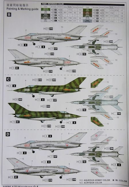 Bemalung: Die Bauanleitung führt in zwölf Schritten zum Ziel. Es liegen Abziehbilder für drei chinesische und eine nordkoreanische Maschine bei. Wartungshinweise fehlen. Bei den Farbangaben bezieht man sich auf die Systeme von Mr.Hobby, Vallejo, ModelMaster, Tamiya und Humbrol.