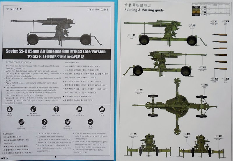 Bausatz: Trumpeter hat eine weitere Variante der 85mm Flak herausgebracht. Es ist das Produktionsmodell von 1943. Nach Öffnen der Verpackung ist der erste Eindruck super. Das Modell präsentiert sich in einen trumpetertypischen Karton. Das Deckbild wurde sehr gut gestaltet und steht denen von Dragon in nichts nach. Wieder ein echter "Hingucker" für Kartonsammler. Fast zu schade zum wegwerfen, wenn das Modell fertig ist. Die achtseitige s/w Bauanleitung ist gut und sehr übersichtlich gestaltet. Sie führt in 14 Abschnitten zum Ziel. Wenn man jeden Abend einen Abschnitt verbaut, dann liegt man, so denke ich, gut im Rennen.