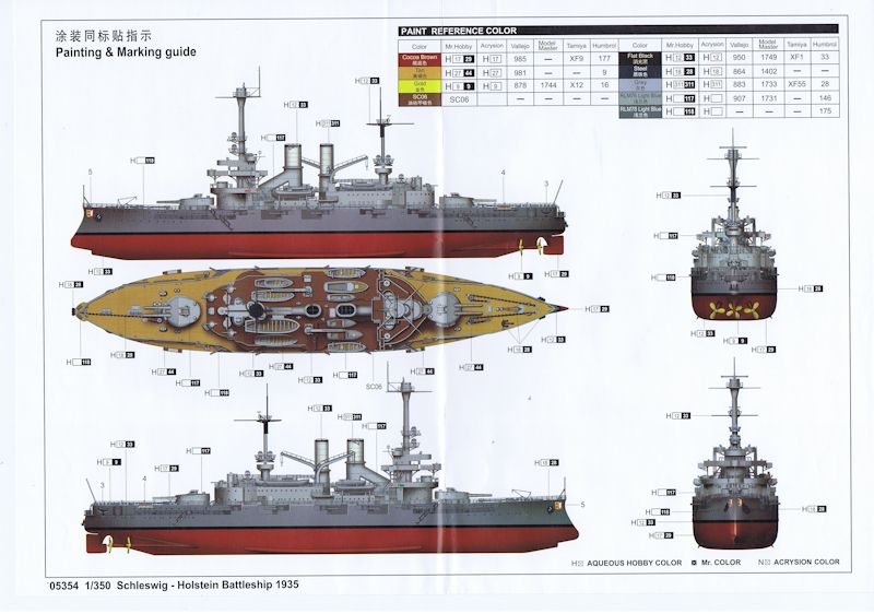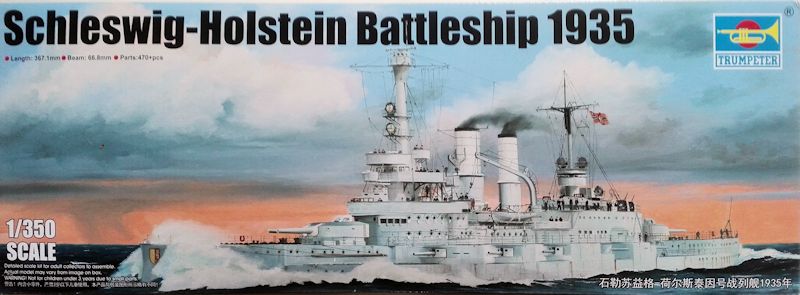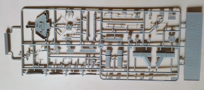 Bausatz: Trumpeter liefert mit der Schleswig-Holstein (Baustand 1935) einen interessanten Bausatz eines Kriegsschiffes, das eine bewegte Geschichte hatte. Noch dieses Jahr kommt dieses Schiff auch als Variante von 1908 auf den Markt. Lassen wir uns also überraschen. Der Stülpkarton beinhaltet 16 Plastikbeutel mit 13 Spritzlingen und diversen Einzelteilen. Also über 470 Teile. Des Weiteren finden sich die Bauanleitung mit einem extra Farbblatt, Decals, eine Ankerkette sowie sechs Ätzteilplatinen im Karton. Die Plastikteile sind sauber gespritzt und weisen lediglich an später nicht sichtbaren Stellen Auswerfermarken auf.