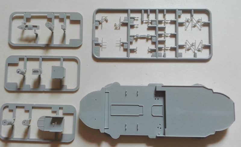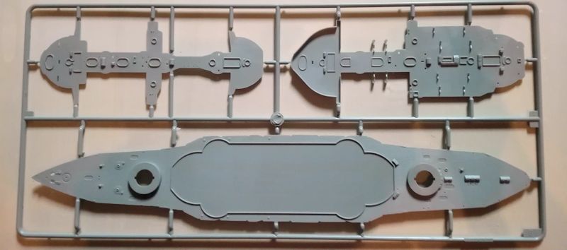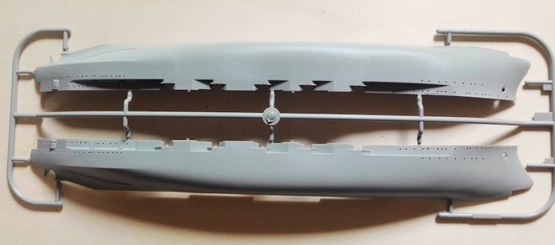 Der Rumpf besteht aus zwei Hälften, welche beim Zusammenkleben zusätzlich mit einigen Querschotten stabilisiert werden. Dies ist bei einer Rumpflänge von 36,7cm durchaus sinnvoll (für sogenannte Nietenzähler. Der Rumpf ist 3mm zu lang). Leider ist der Rumpf sehr einfach gehalten. So fehlen z.B. Plattenstöße die man selber nachgravieren sollte, wenn man nicht einen völlig glatten Rumpf haben will. Auch die einzeln zusammenzusetzenden Wellenhosen werden wahrscheinlich zu einigen Spachtel- und Schleifarbeiten führen. Da der Rumpf als Vollrumpf ausgeführt ist (was Trumpeter anscheinend zurzeit wieder favorisiert), werden Waterline-Bauer sicher fluchen, ist doch heftiges Sägen angesagt. Dafür liegt auch ein Ständer bei.