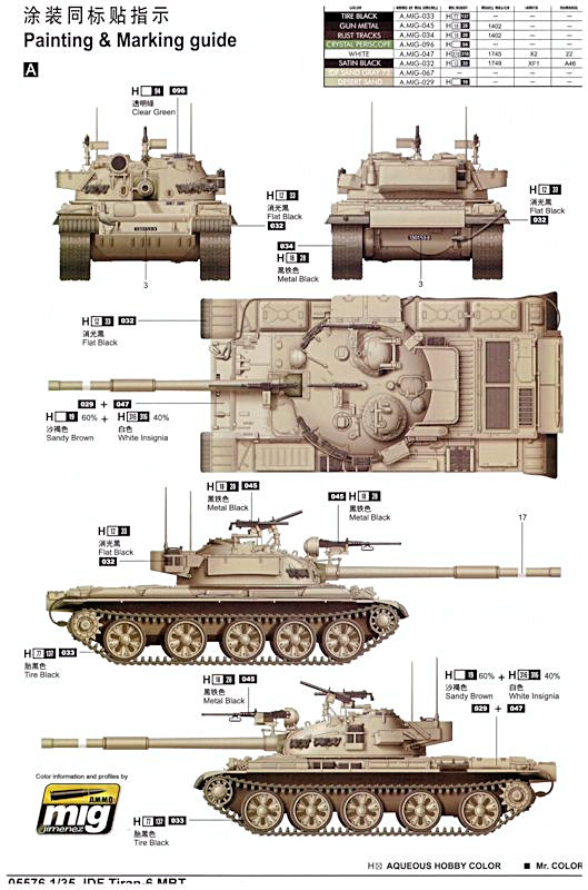 Bemalungsvarianten: Als Abziehbilder liegen für zwei Varianten vor. Eine hat nur zwei Nummernschilder. Die zweite verfügt zusätzlich über taktische Zeichen und Nummerierungen. Der farbige Bemalungshinweis zeigt beide Fahrzeuge in einfarbigen israelichem Sandton.