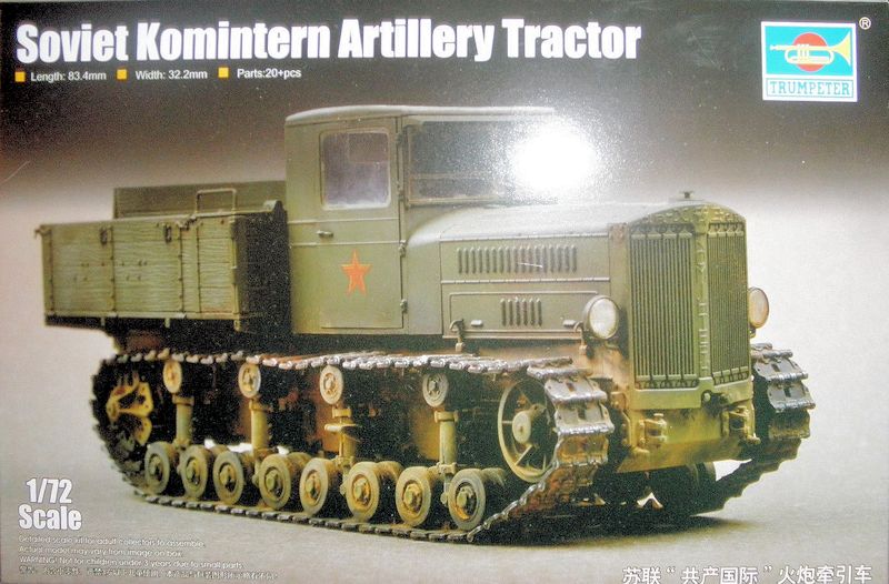 Vorbild: Der Komintern Artillerie Traktor basierte auf dem Laufwerk des T-12 bzw. T-24 Panzers. Er diente zum Ziehen der schweren Feldhaubitzen (122 und 152 mm). Von 1935 bis 1941 wurden ca. 2000 Stück gebaut. Neben den Streitkräften der UdSSR setzte die Wehrmacht etliche Komintern als Beute ein.