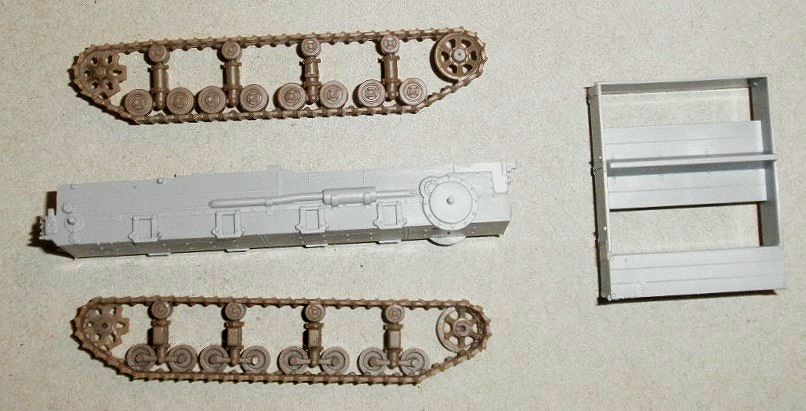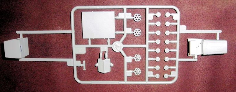 Ein mittelgroßer Spritzrahmen, der folgende Teile enthält: Kabine, äußere Kettenräder und Kühlergrill. Die Kettenlaufwerke sind in einen Teil gegossen und sehen richtig gut aus. Pritsche und Wanne liegen ebenso bei.
