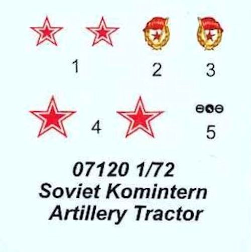 Bemalungsvarianten: Der kleine Decalbogen ist versatzfrei auf blauem Papier gedruckt und völlig ausreichend, denn im Einsatz trugen die meisten sowjetischen Komintern gar keine Markierungen.