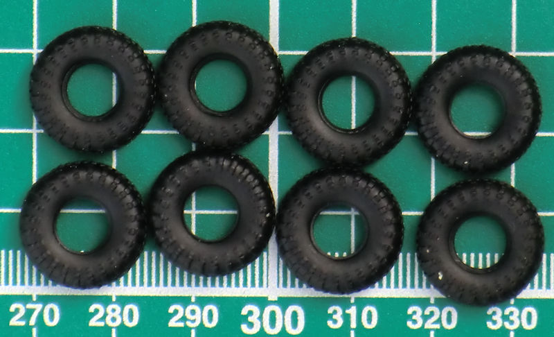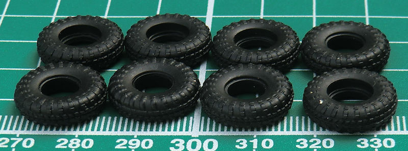 Ein Makel fällt allerdings sofort ins Auge: Es sind die Gummireifen. Diese haben zwar ein schönes Profil aber es fehlt ihnen deutlich 1/3 der Breite. Abhilfe findet man z.B. bei HAULER. Die haben immerhin ein Set für den Vorgänger BRT-60 im Programm…