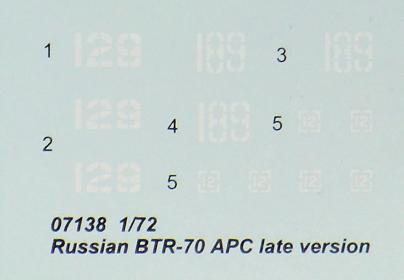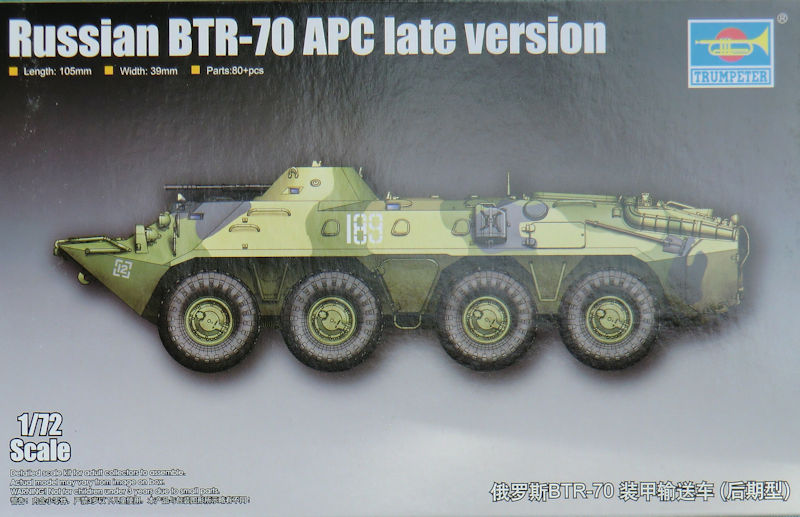 Bausatz: In jüngster Zeit beschäftigt sich TRUMPETER wieder mit Militärfahrzeugen im Maßstab 1/72. So erschienen auch zwei Bausätze zum Thema BRT-70. Zuvor gab es Bausätze von ACE, YUMKT und PLANETmodels. Diese waren aber eher etwa für starke Nerven. Hier geht es um eine späte Version des BTR-70 In dem attraktiven Stülpkarton befinden sich gut verpackt zwei Wannenteile, zwei Spritzgussrahmen mit 74 Teilen, acht Gummireifen, ein Decalsatz und die Bauanleitung. Trumpeter hat nur den Spritzrahmen B (frühe Ausführung) gegen den neuen C ausgetauscht. Somit sind die notwendigen Teile für eine späte Ausführung des BTR-70/SPW-70 enthalten.