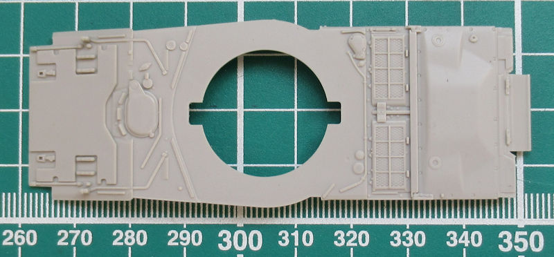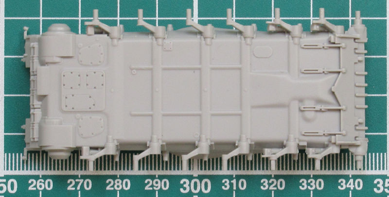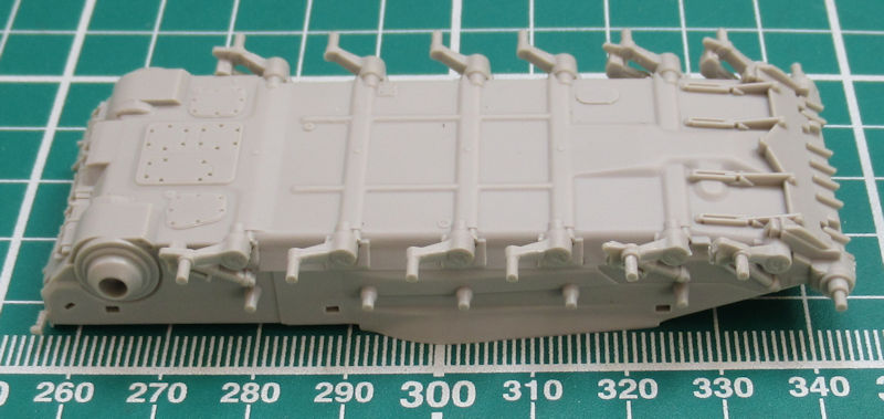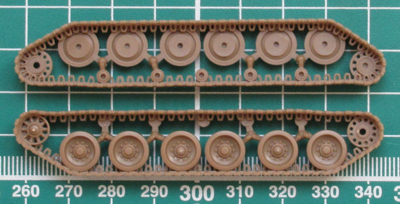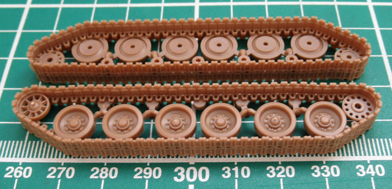 Der Zusammenbau ist einfach gestaltet. Die Unterwanne besitzt anmodellierte Schwingarme und die Oberwanne sehr schöne Details. Spannend ist die Montage des Laufwerks. Hier werden zuerst die einzelnen inneren Lauf- und Leitrollen montiert und dann kommt schon im Bauschritt 3 die Hochzeit mit dem äußeren Teil. Schwieriger ist wohl eher die perfekte Farbgebung. Leider verschwindet die ganze schöne Pracht hinter den Abdeckungen.