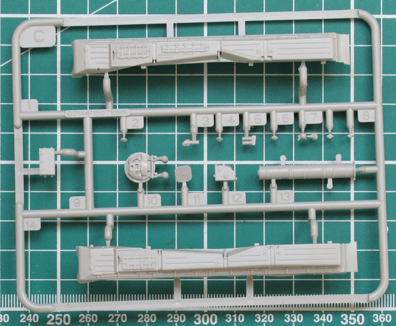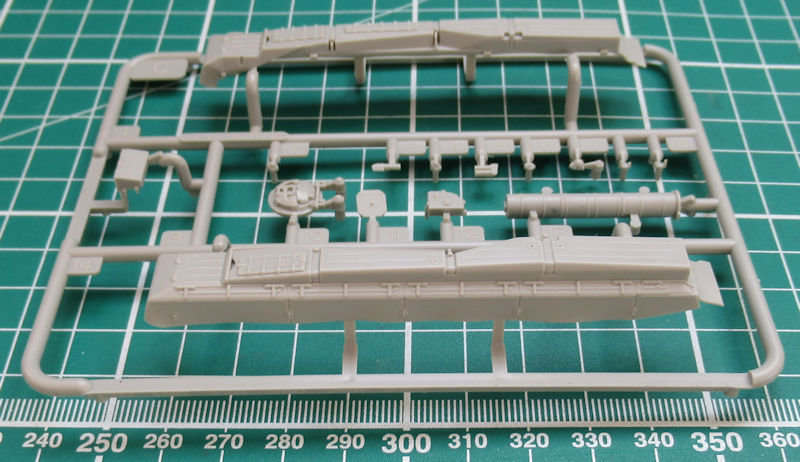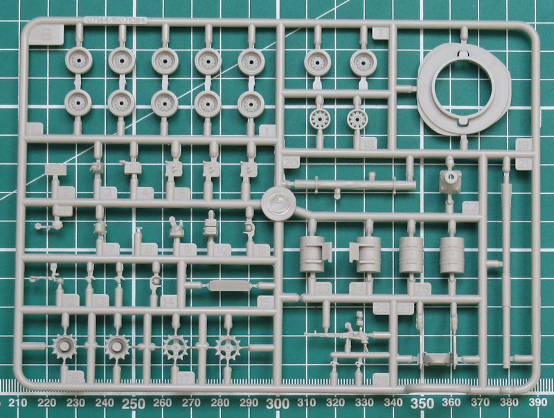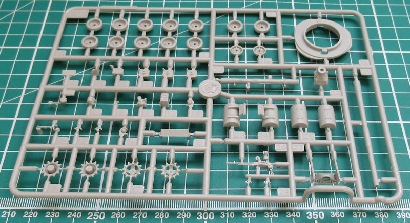 Im attraktiven praktischen Stülpkarton befinden sich gut verpackt zwei hellgraue Spritzlinge mit 60 Teilen, drei Großbauteilen sowie die beiden Kettenlaufwerke, ein Decalbogen und die Bau- und Bemalungsanleitung. Beim Betrachten der Bauteile bekommt man strahlende Augen. Der Formenbau hat hier Hervorragendes geleistet. Allein die komplexe Kette samt anmodellierter Laufrollen ist eine Augenweide. Was TRUMPETER hier mit einem dreidimensionalen Werkzeug produziert hat ist absolut erste Liga! Die Kette sieht sehr realistisch aus und hat durchbrochene Zähne. Weiterhin hängt sie durch. Einzig ein paar Angüsse müssen noch entfernt werden.