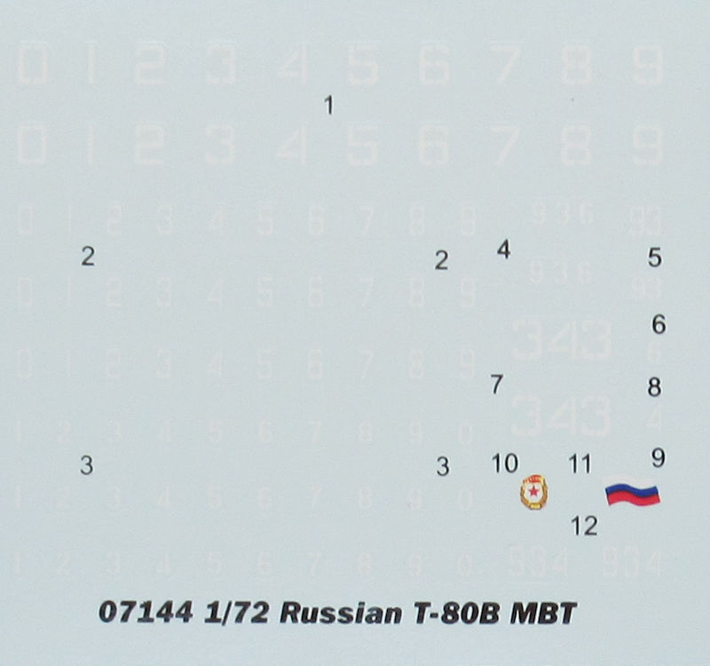Leider gibt es bei den beiden etwas zu kleinen Bemalungshinweisen keinerlei Informationen zum Vorbild. Der Decalbogen enthält weiße Ziffern und eine russische Flagge sowie ein Gardeabzeichen. Die Farbhinweise sind für die Systeme von Mr.Hobby, Vallejo, ModelMaster, Tamiya und Humbrol.