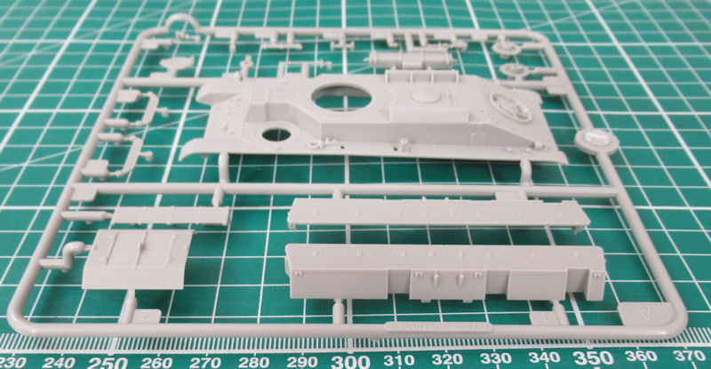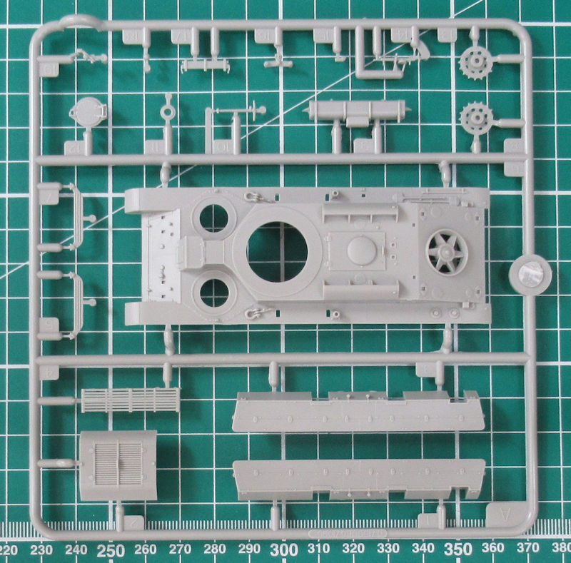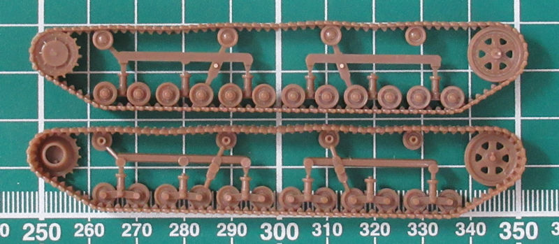 Die Abspritzung ist voll auf der Höhe der Zeit. TRUMPETER hat hier die Laufwerksteile zusammengefasst. Das vereinfacht den Zusammenbau erheblich. Es funktioniert allerdings nur auf Kosten der Detaillierung, denn von Innen sind die Ketten bisschen platt… Die Masse der Teile ist hier im Fahrwerk zu verbauen. Ein paar Ersatzlaufrollen werden noch auf der Wanne montiert.