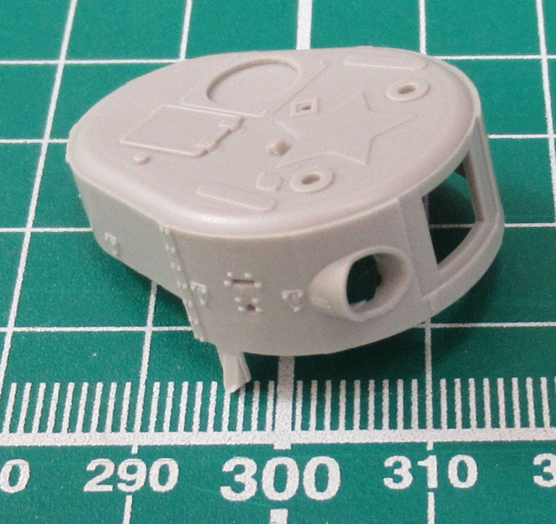 Die beiden MG-Türme bestehen aus wenigen Teilen. Leider bleiben die Luken zu. Beim Hauptturm hat man den Stern aufmodelliert. Hier wird die Luke separat angeklebt. Wer diese offen haben möchte, der muss nur noch die Scharniere umarbeiten. Aufpassen muss man auf die sehr filigrane Antenne. Diese sollte den Abschluss der Montage bilden.