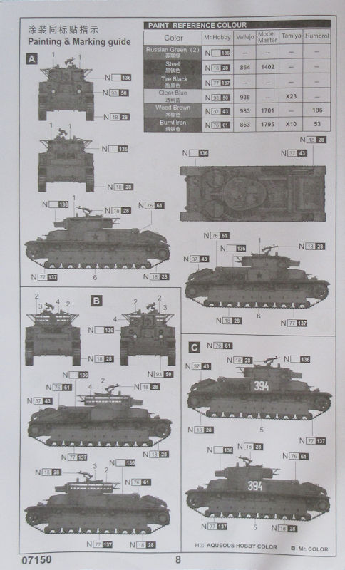 Der kleine Decalbogen ist tadellos gedruckt. Die Bemalungshinweise sind ein wenig klein und leider nicht in Farbe. Es gibt auch keinerlei Informationen zum Vorbild! TRUMPETER verweist auf die Farbsysteme von Mr.Hobby, Vallejo, ModelMaster, Tamiya und Humbrol.