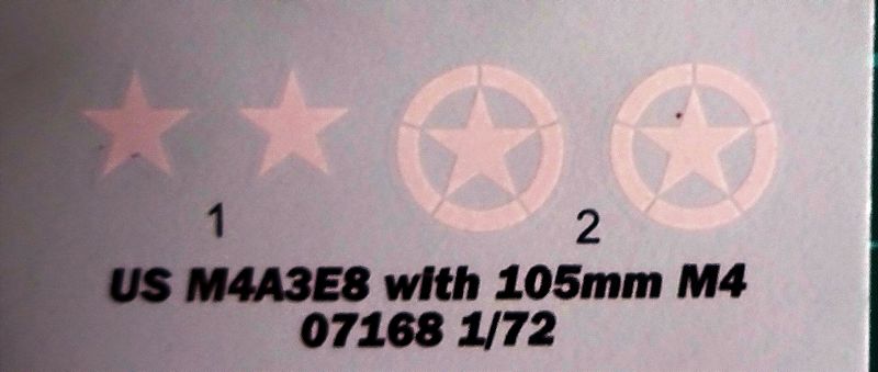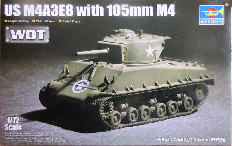 Bausatz: Trumpeter hat hier dem Sherman M4A3E8 (easy 8) herausgebracht. In dem schön gestalteten Stülpkarton befinden sich fünf hellgrau Gießäste, die Unterwanne, zwei schwarze Gummiketten, die Bauanleitung ein kleiner Abziehbilderbogen und die Grundplatte.