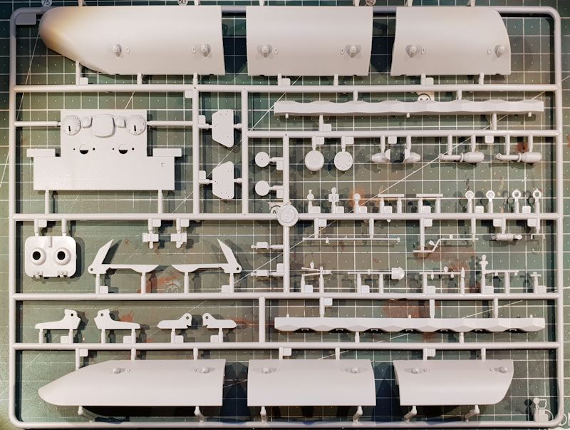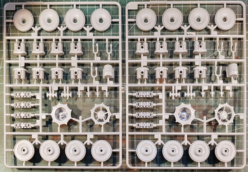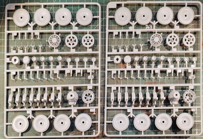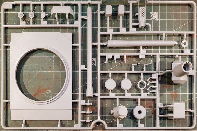 Es sind auch "nur" 250 Teile zu verbauen. Die Teile sind sehr sauber gegossen und lassen nur wenige mit einem Grat erkennen. Am auffälligsten sind dabei die beiden Kanonen, die beide längs an der Seite einen leicht zu entfernenden Grat besitzen. Und ja, es sind zwei unterschiedliche Läufe enthalten. Man hat die Möglichkeit den Turm mit der für den E-100 gedachten 15,0cm-KwK auszurüsten, mit der markanten Mündungsbremse, oder mit der für die Maus gedachte 12,8cm-KwK.