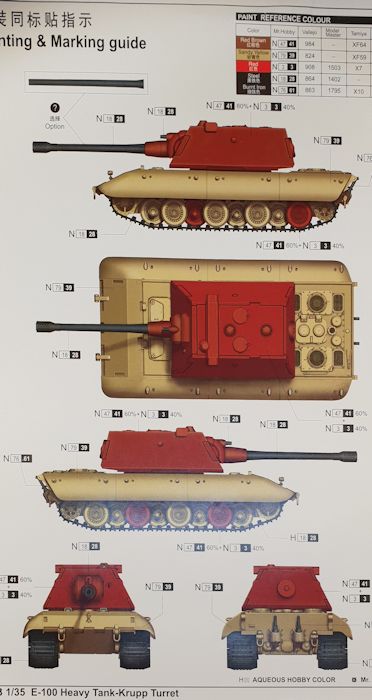 Bausatz: Wie von Trumpeter üblich, ist der gesamte Bausatz in einem stabilen Karton verpackt mit einer sehr guten Illustration. Die Bauanleitung ist sehr übersichtlich und sehr gut in einzelne Schritte gegliedert. Die gesamte Anleitung hat 12 Seiten, womit man auch den recht simplen Aufbau des E-100 erkennt.