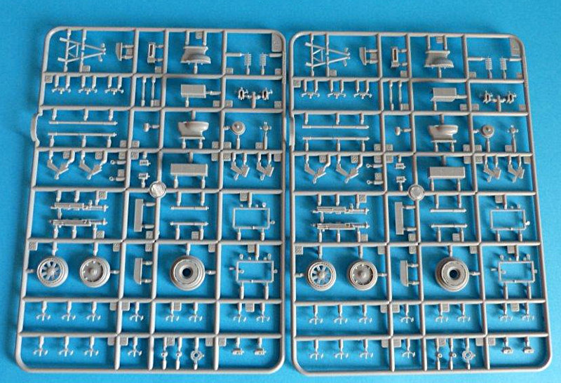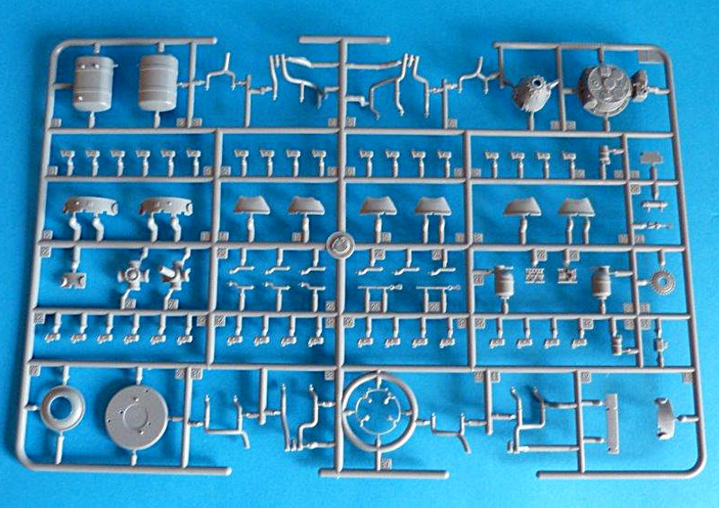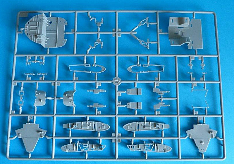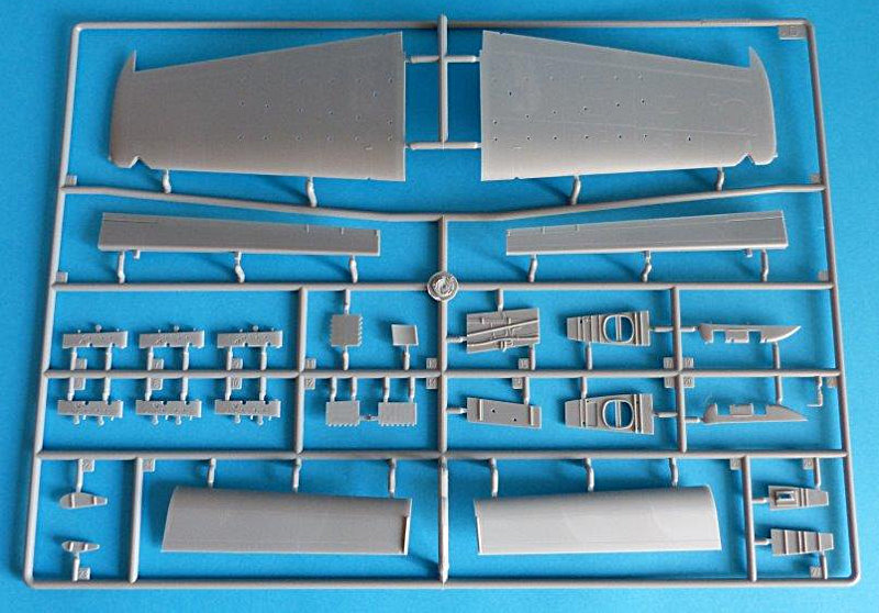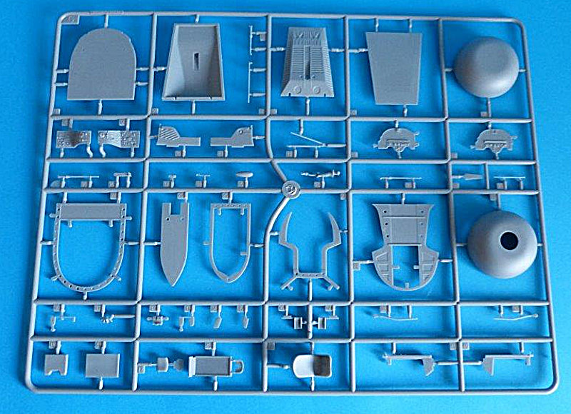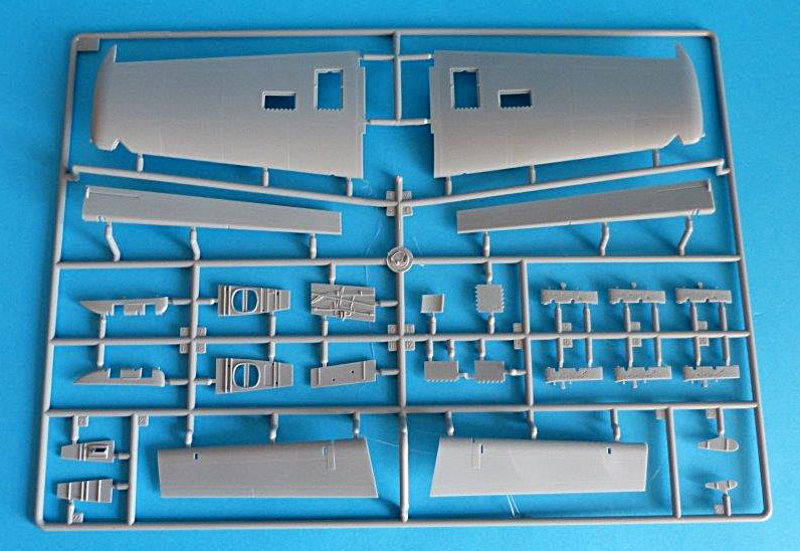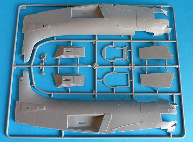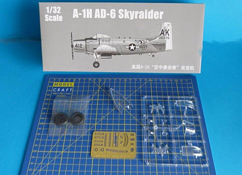 Der Bausatz: Der große, stabile Stülpkarton ist voll gepackt mit grauen Spritzrahmen, die schon aus dem Trumpeter Bausatz der AD-1 bekannt sind. In einem separaten Pappkarton sind eine kleine Ätzteilplatine, die Klarsichtteile und die Bereifung enthalten. Der Flugzeugrumpf, wurde überarbeitet und weist die korrekte Zusatzpanzerung auf, wie sie bei späteren Skyraiderversionen angebracht wurde.