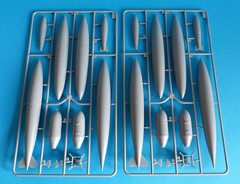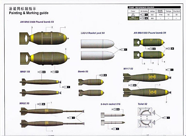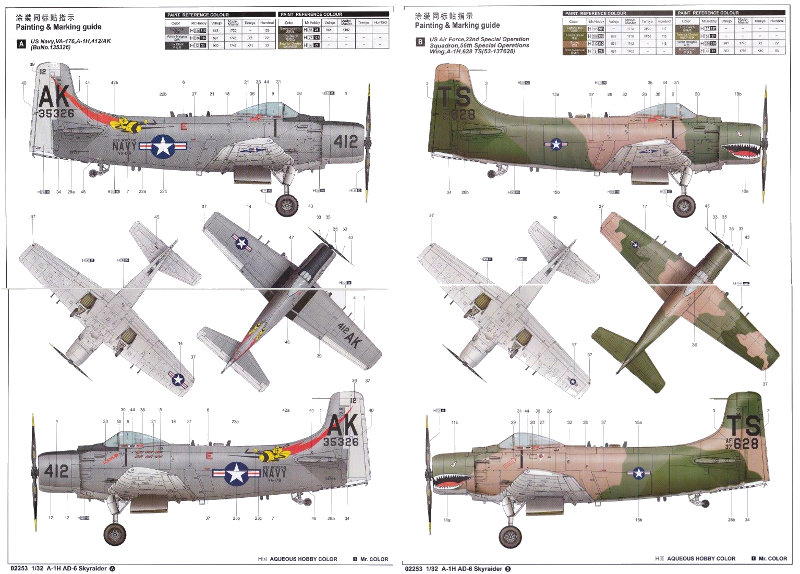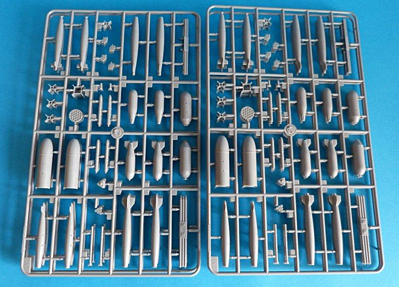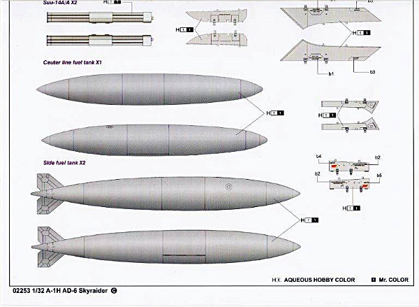 Der Waffensatz umfasst vier Gussäste. Außer den 5-inch Raketen, die für die frühe AD-1 Bausatz vorgesehen waren, können die anderen Abwurfwaffen und Raketen wie LAU-3 Raketenbehälter und SUU-14 A/A angebracht werden. Auch drei Flügeltanks liegen dem Bausatz bei. Die Bauanleitung umfasst 24 Seiten. Ich hätte mir mehr Farbangaben gewünscht und wie schon erwähnt geht die Bauanleitung nicht immer auf die späte A-1H ein.